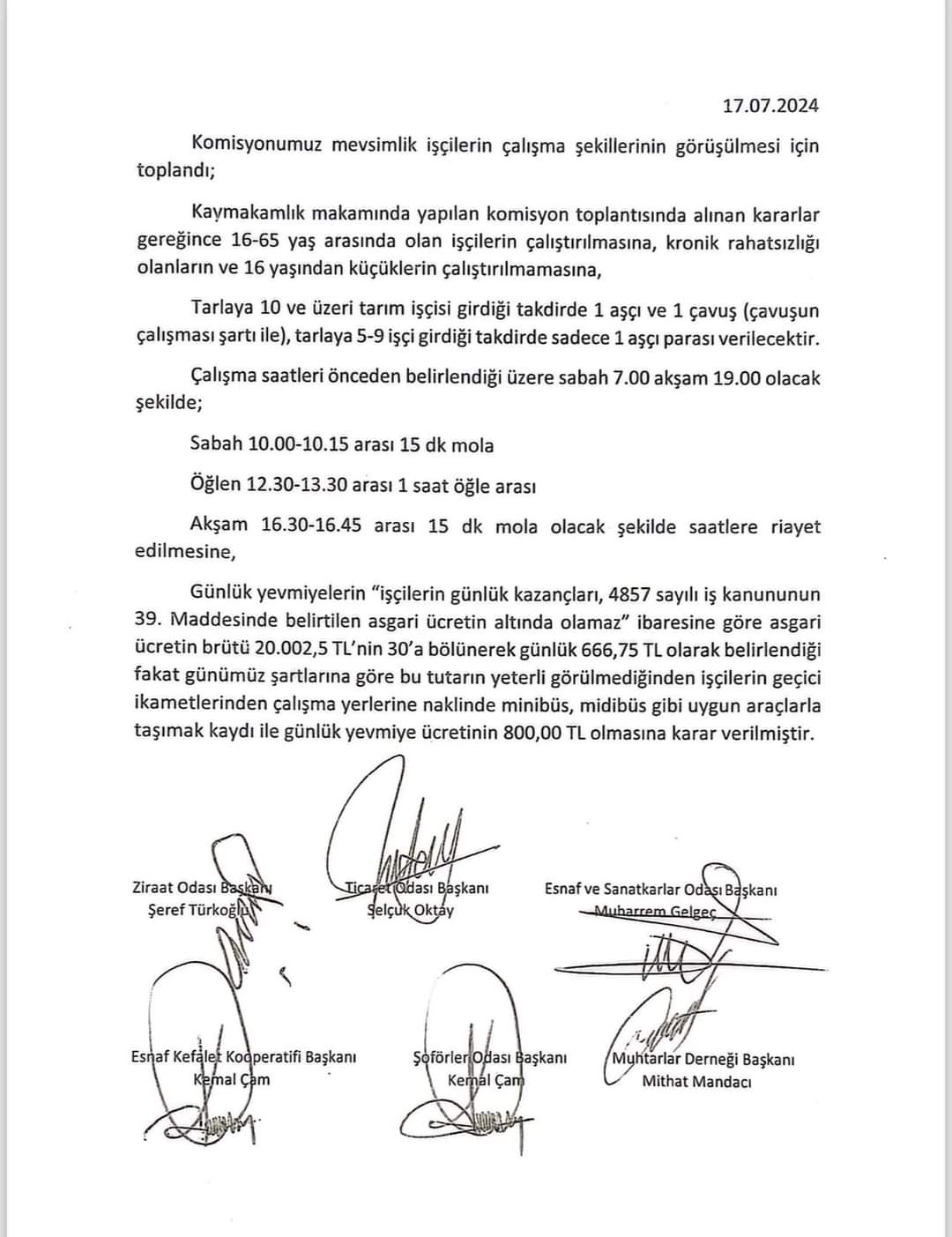 Zonguldak Alaplı Ziraat Odası Komisyonu mevsimlik tarım işçilerinin yevmiye ücretlerini ve çalışma şartlarını belirledi.