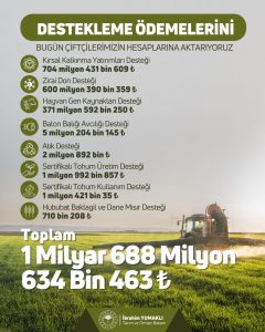 🤝 1 milyar 688 milyon TL tarımsal destek ödemesi bugün çiftçilerimizin hesaplarına aktarılıyor.