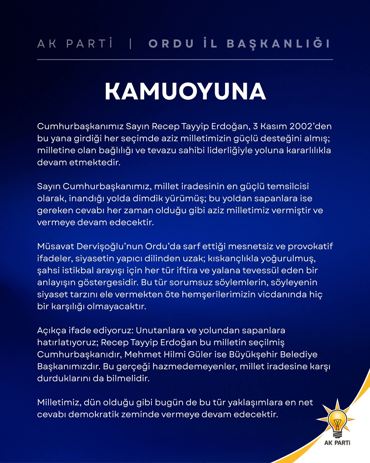 İYİ Partil Genel Başkanı Müsavat Dervişoğlu’nun Ordu ve İlçelerinde yaptığı ziyaretler de iktidara ve Ordu Büyükşehir Belediye Başkanı Hikmi Güler’e sarf ettiği sözler ve eleştiriler nedeniyle AK Parti İl Başkanı Samet Özdemir bir basın açıklaması yayınlayarak kamu oyunun bilgisine sundu.
