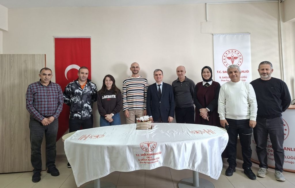 Ünye İlçe Sağlık Müdürlüğü personelleri Dr. beyin bu başarısını tebrik ettiler ve pasta keserek kutladılar.